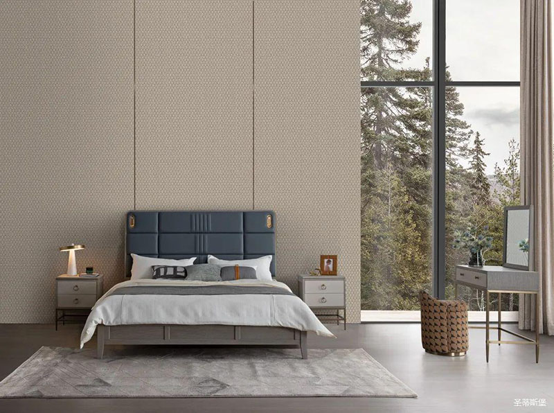 主卧拥有贴近自然的魔力,蓝色床屏色彩与外界的自然绿相互吸引,凹凸的线性块状软包设计,线条轻盈又流畅,打造了卧室背景强烈的立体感,金属包裹的感应小夜灯,守护你的每个夜晚,令睡眠更具安全感。