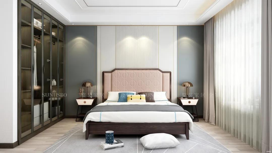 次卧的对称极简主义让人拥有奢华、简约居家质感。倒梯形的几何床头柜和奢华的水母造型床头灯,都让空间散发着华贵的魅力。嵌入式的立面衣橱,运用不同的材质将极简的协调效果达到极致,收纳空间层层分区,让每一件物品都有迹可循。